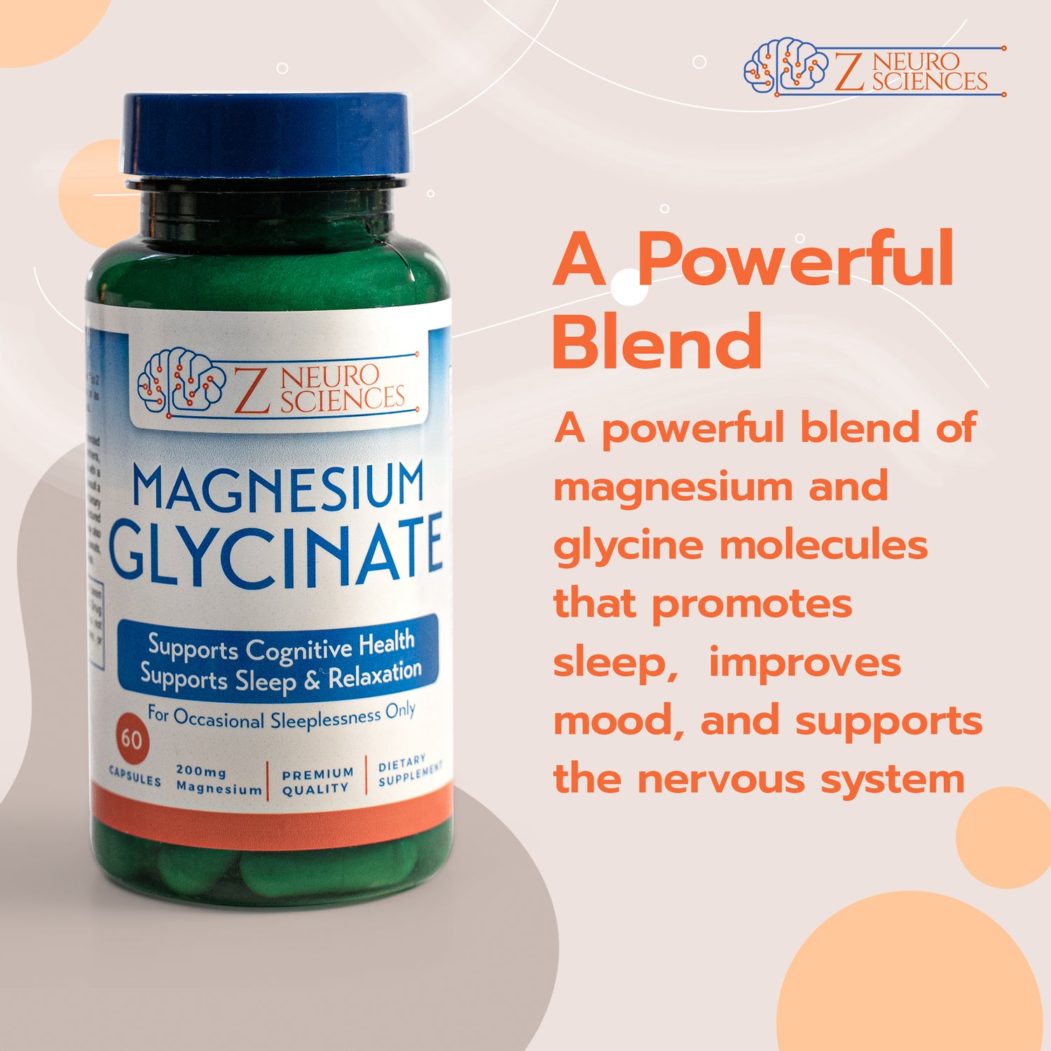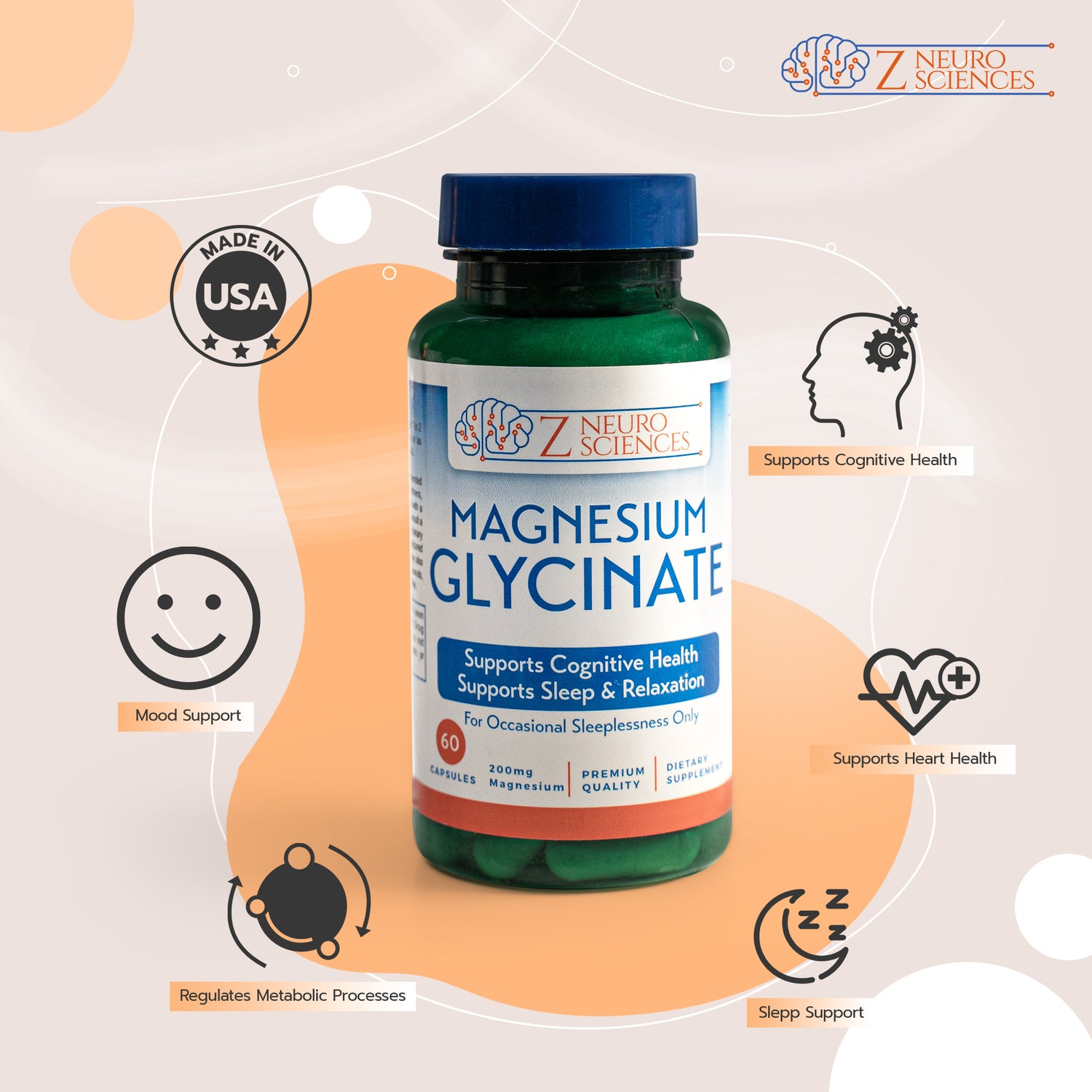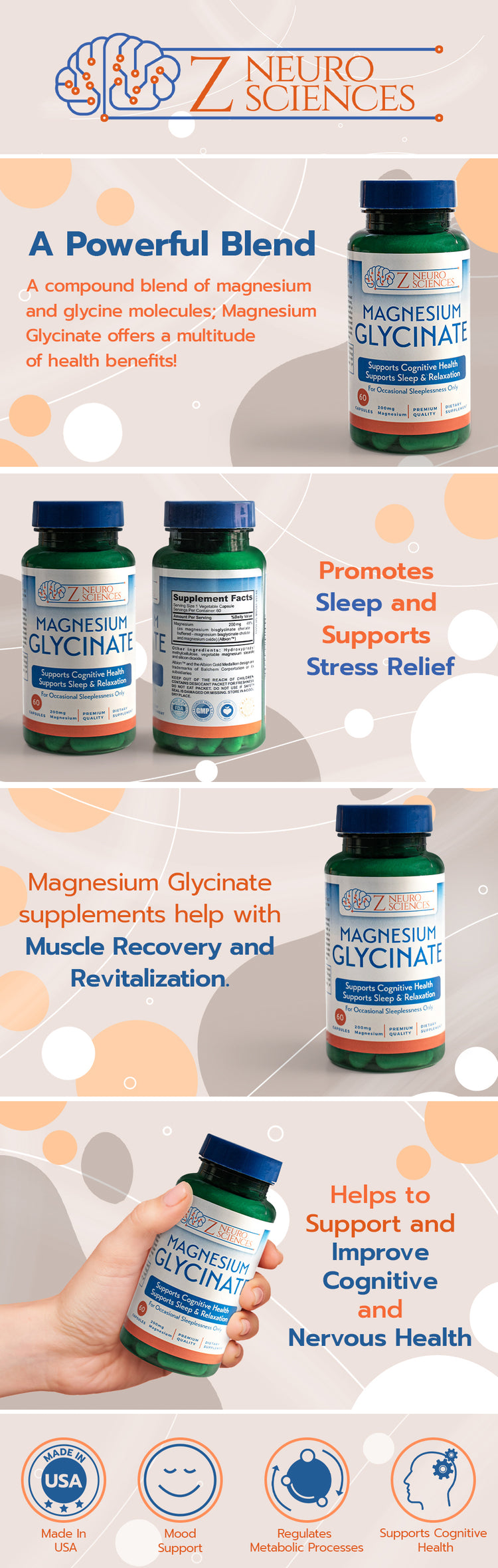 Magnesium glycinate is an essential mineral that helps to break down carbohydrates, amino acids, fats, and other essential nutrients. It has been found to provide sleep support, helps support healthy muscle and nerve function, as well as energy production. It also promotes stress relief, and improved sleep.