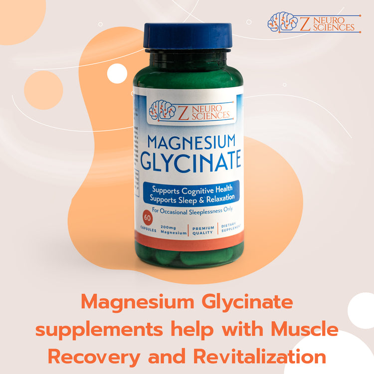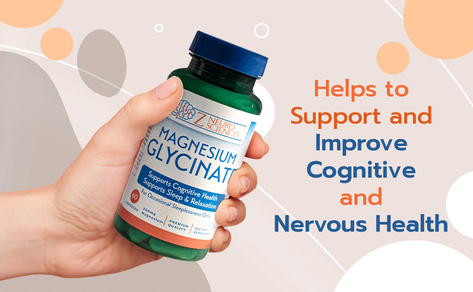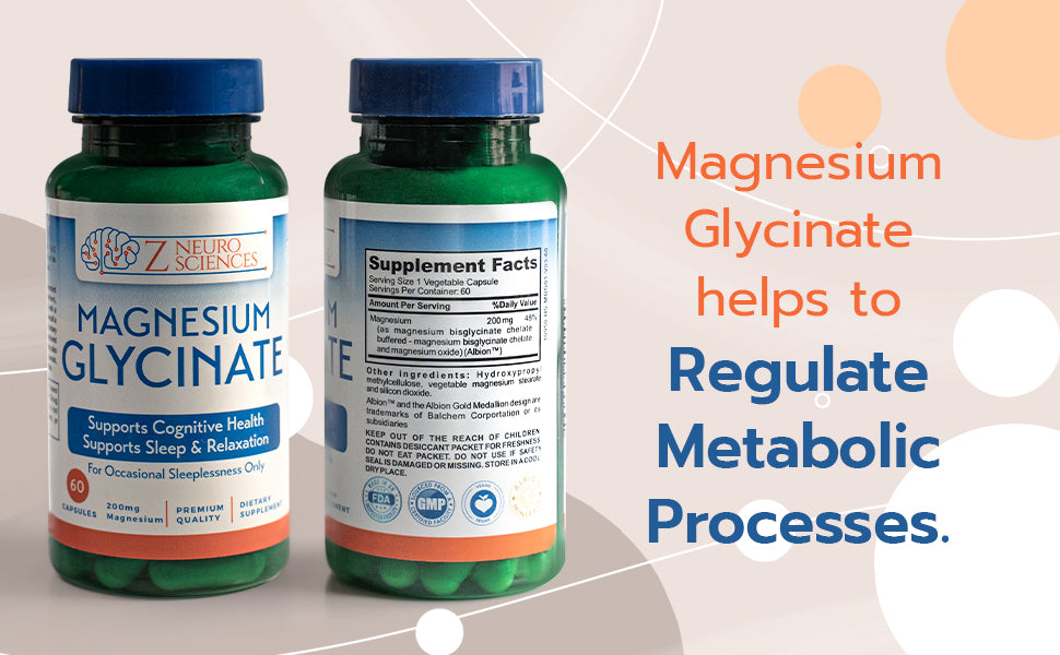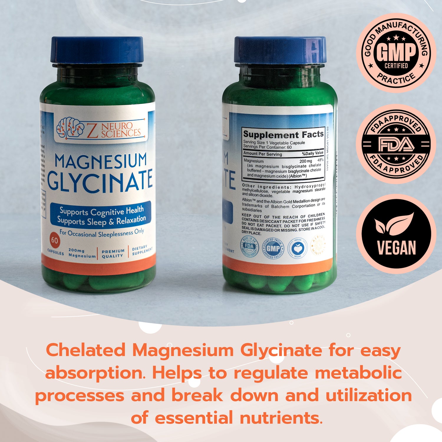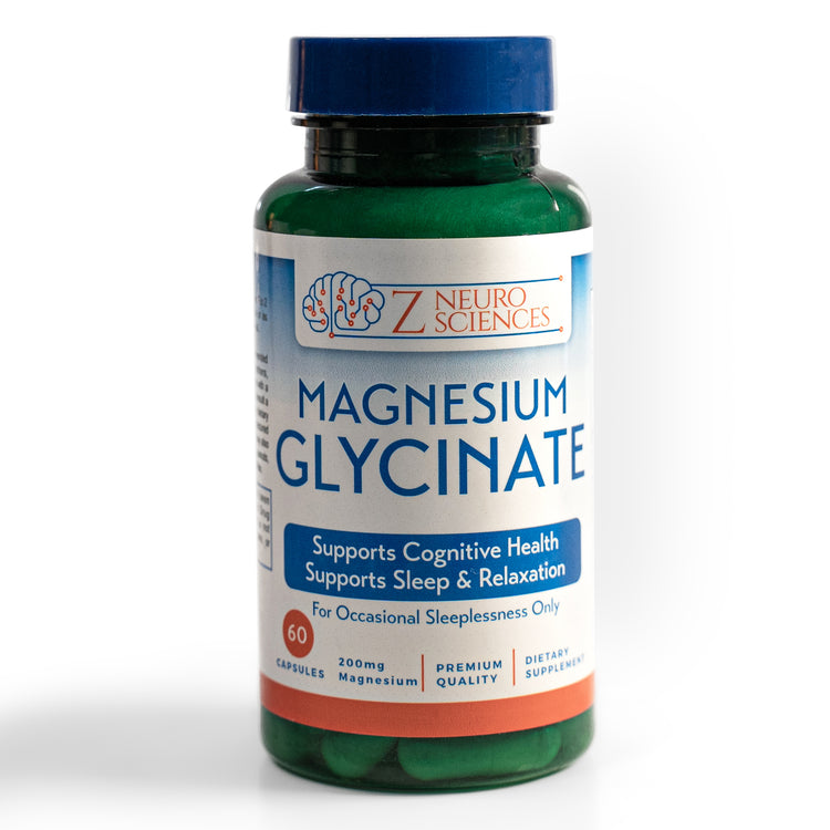 Magnesium glycinate is an essential mineral that helps to break down carbohydrates, amino acids, fats, and other essential nutrients. It has been found to provide sleep support, helps support healthy muscle and nerve function, as well as energy production. It also promotes stress relief, and improved sleep.